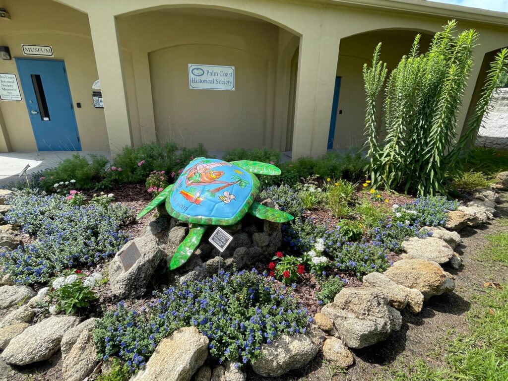 Nearby is one of Flagler County’s decorated public art turtles, inspired by Garfield, who served as a mascot during Palm Coast’s early years. The turtle is part of the Turtle Trail, a public art initiative presented by Flagler Arts and Culture Council, which places artist-designed turtles throughout Flagler County.